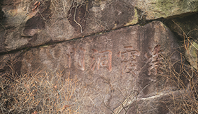 在冠岳山景色最美丽的溪谷紫霞洞,西侧岩壁上雕刻着四个岩字。