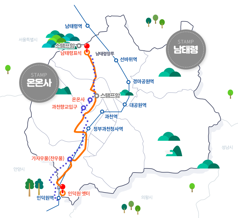 - 삼남길 제1길 ~ 한양관문길 : 남태령 표석 - 온온사 - 과천향교입구 - 가자우물(찬우물) - 인덕원옛터