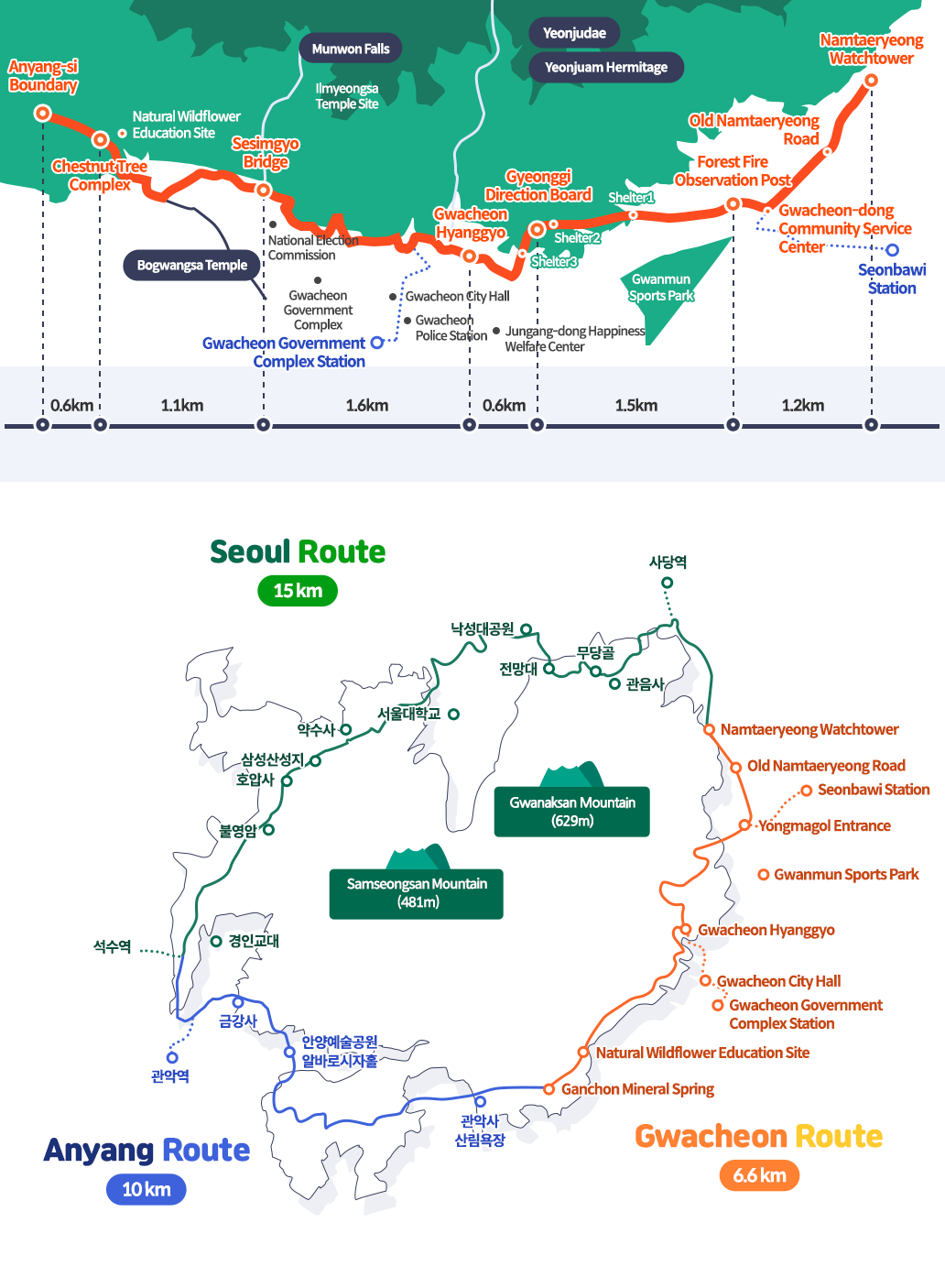 It is a nature trail where visitors can enjoy the beautiful natural scenery, and learn history and ecology while walking on the road surrounding Gwanaksan Mountain, which is located on the border of Gwacheon, Anyang, and Seoul.