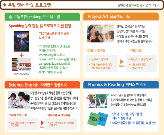| 파닉스 앤 리딩 | 초1~3 | 10:50~12:10 (80분 수업) |