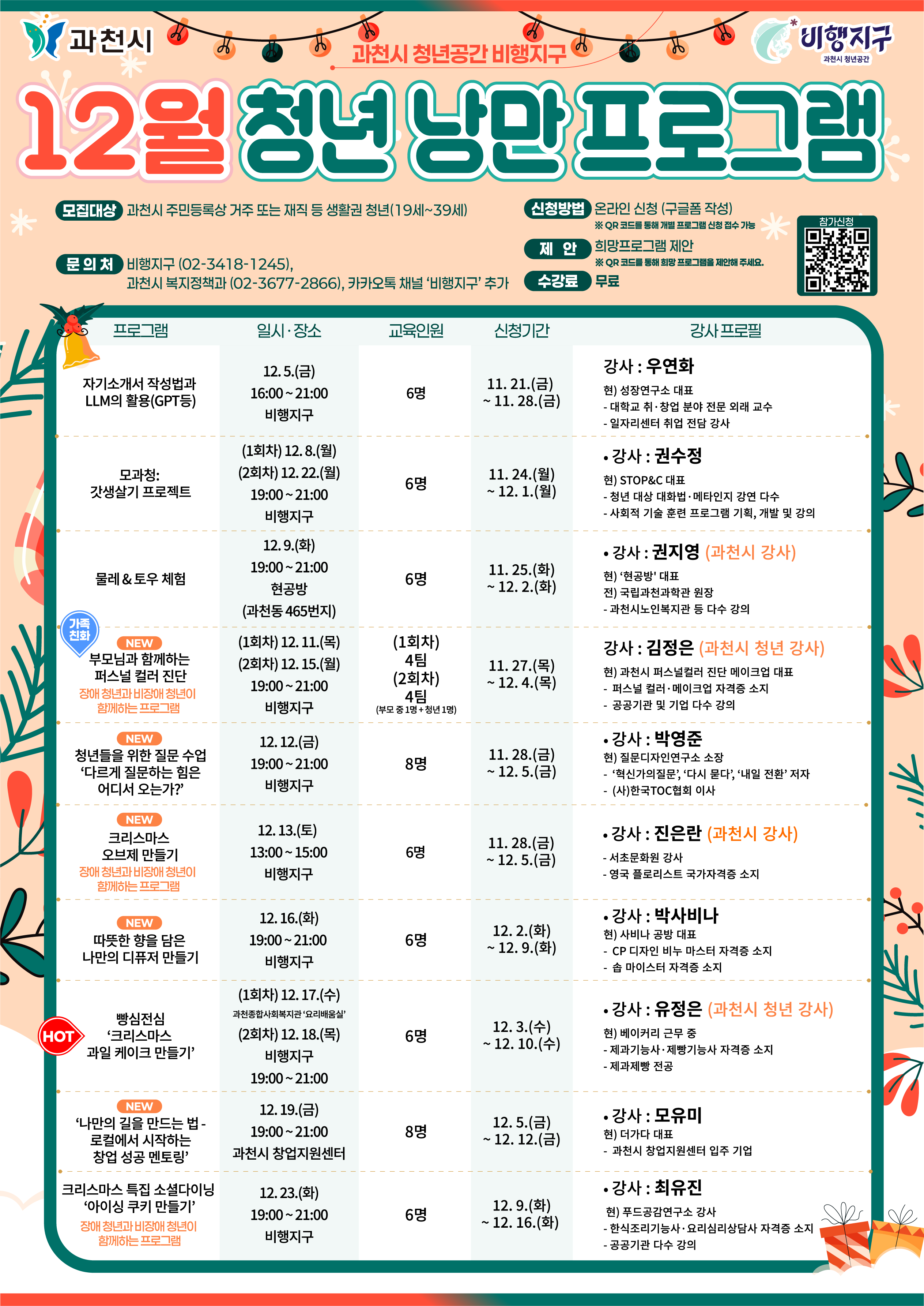 강사모집 : (대상) 과천시 청년 및 거주자 우대, (신청방법) 온라인 신청 또는 비행지구 전화 문의링크 추후 전달