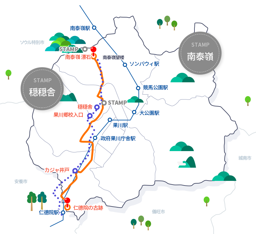 果川から平澤まで約90kmに達する京畿道三南キルは、昔の道の歴史性をできるだけ生かした歴史文化を味わえる道であり地域の生態系と自然も満喫できる道です。