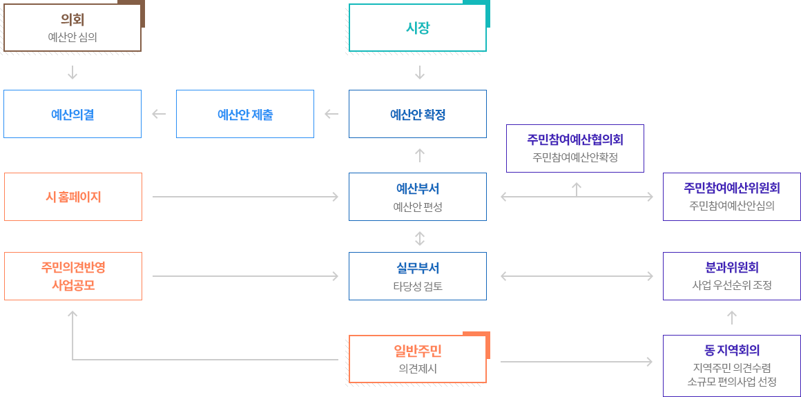 주민참여예산제는 예산편성과정에 주민참여를 제도적으로 보장하고 확대함으로써 재정운영의 투명성을 확보하고 참여민주주의를 실현하는데 그 목적이 있습니다.