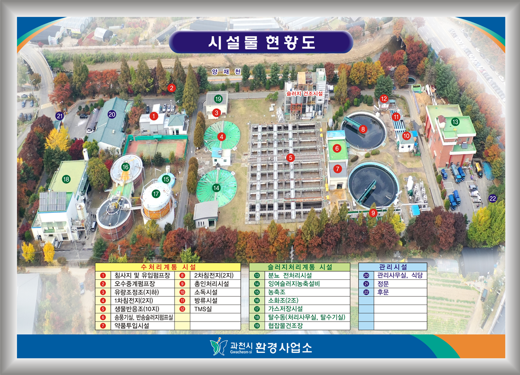 - 주요내용 : 하수처리장 노후화와 도시개발에 따른 여건변화(하수량증가)로 시설용량 부족에 대비하고자 하수처리장 현대화(지하화)사업을 통한 시설용량 확충, 하수처리·운용 효율 개선 및 상부공원·주민편의 시설 계획하여 주민 친화적 시설로 조성