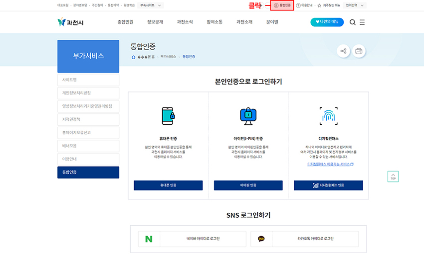 - 과천시에서는 휴대폰, 아이핀, 디지털원패스, 카카오톡, 네이버를 통한 본인인증서비스 이용이 가능하며, 각 사이트 및 프로그램에 따라 본인인증서비스의 제한이 있습니다.