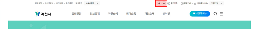 - 홈페이지 상단의 플러스(+), 마이너스(-) 버튼을 통해 화면 크기를 조정합니다.